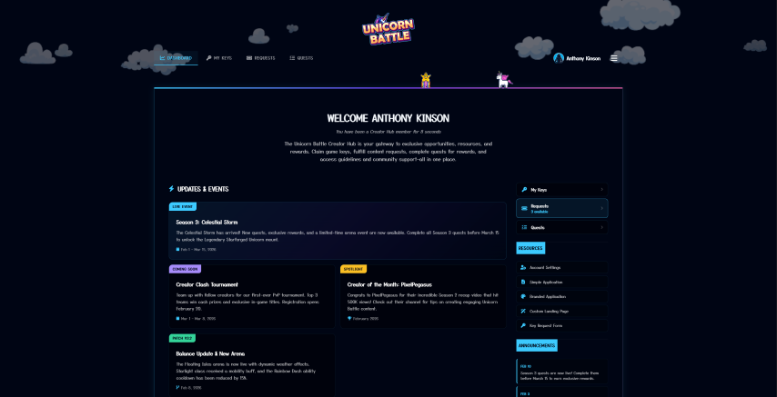 Central hub for creators to manage their profile, track rewards, claim keys and view program status and other information.